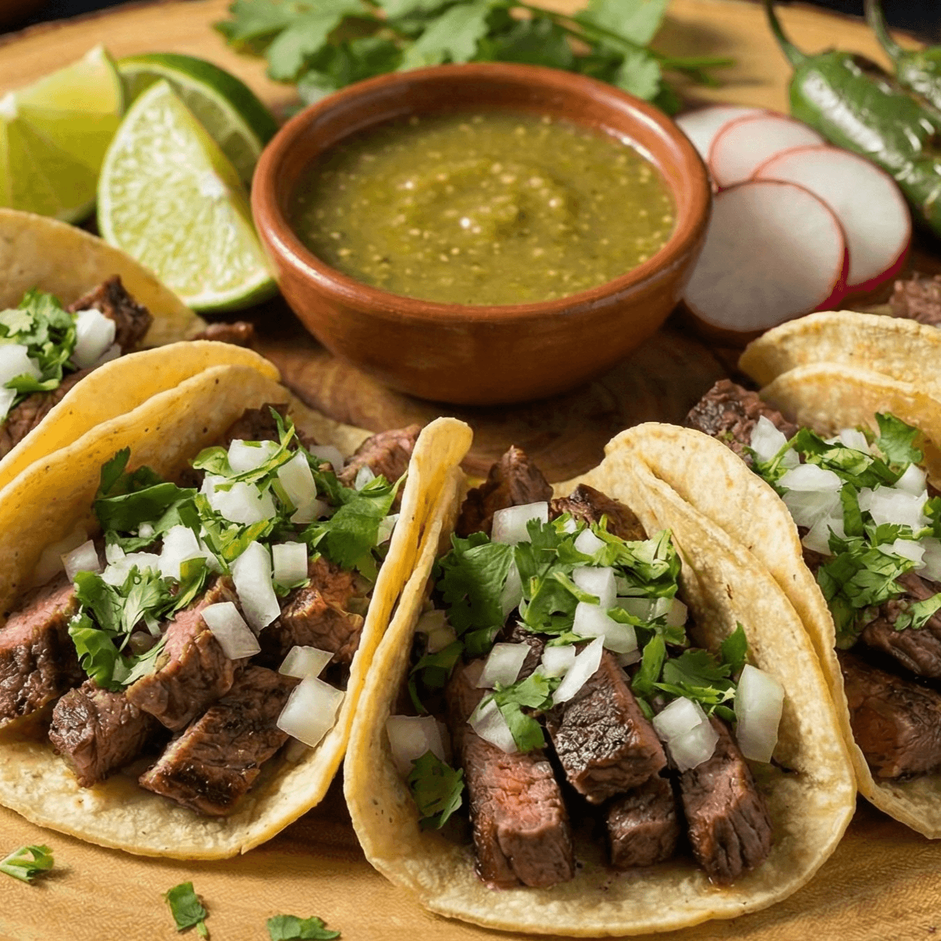 Corn tortilla, protein of your choice, cilantro, diced onions and side of medium salsa.