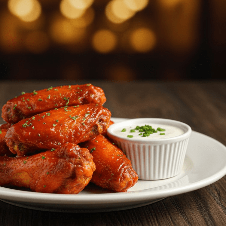 Chicken wings served with a side of cool ranch or blue cheese dressing, celery sticks and carrots. These wings are the perfect appetizer. Many sizes available