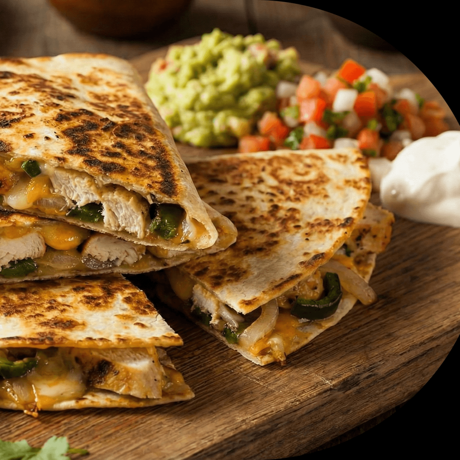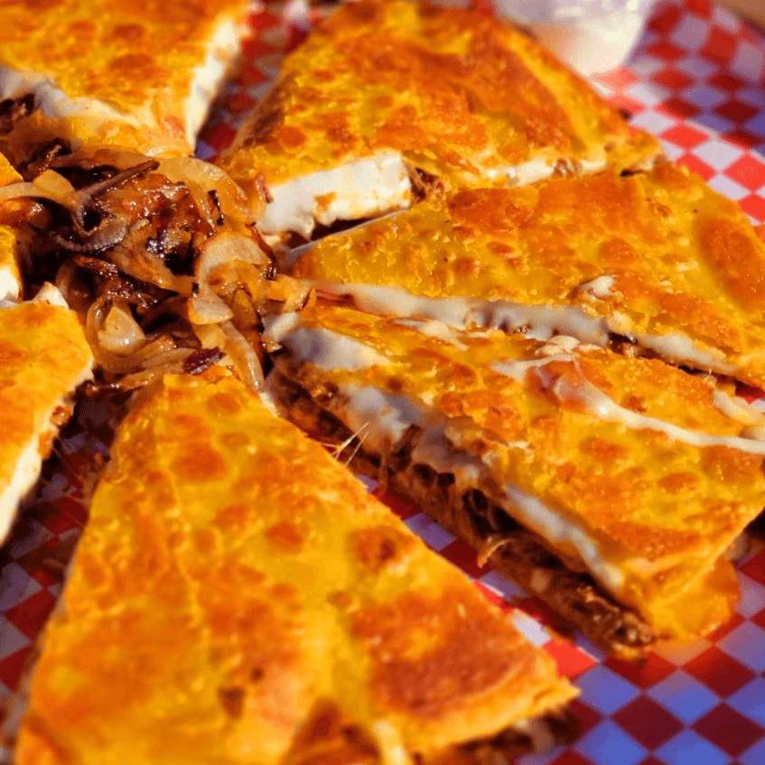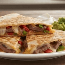 Delicious quesadilla with fresh grilled bell peppers, grilled onions and your choice of meat chicken or steak.