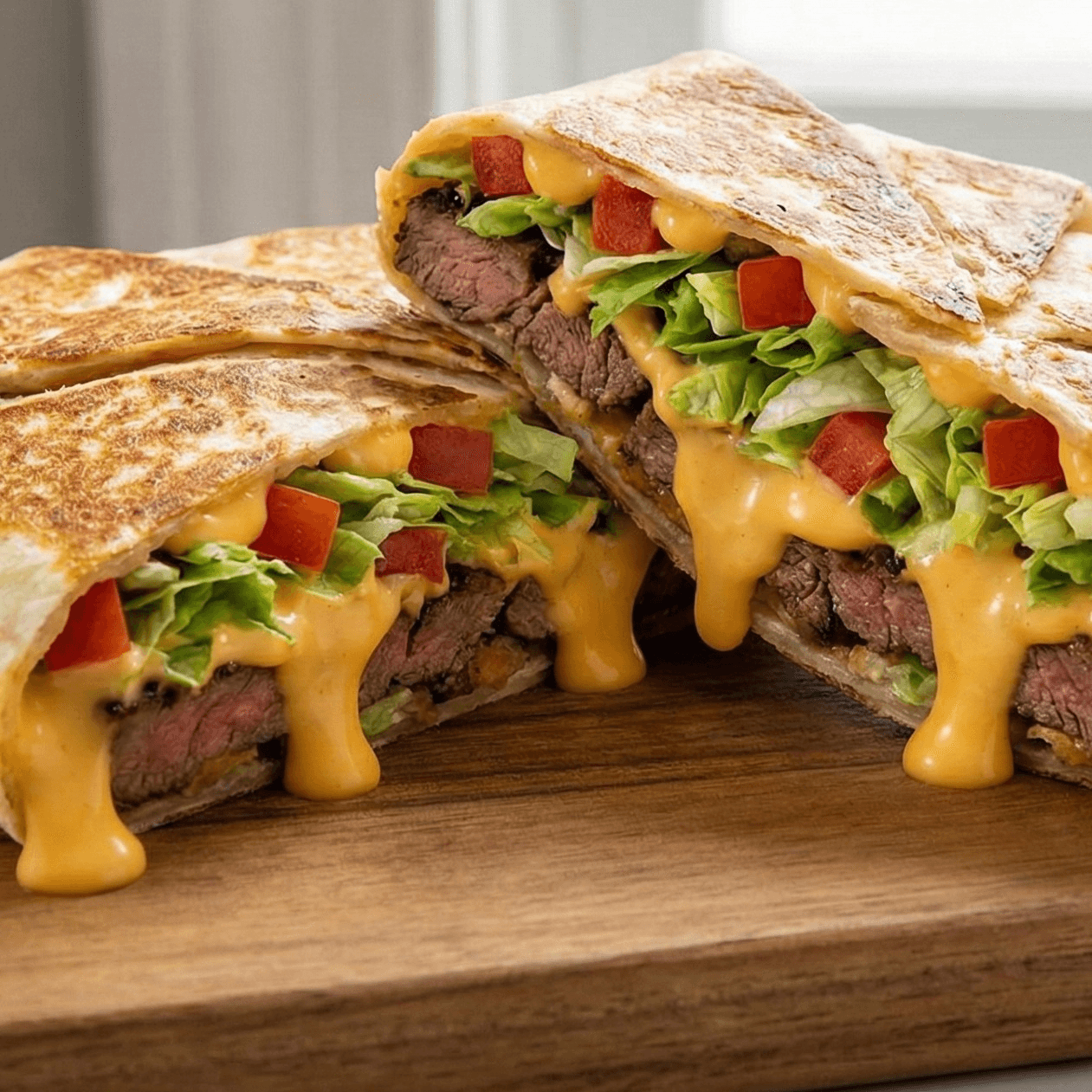 Delicious Mexican folded sandwich with your choice of Chicken, Steak, Pastor, Carnitas or Veggies, served with Queso, lettuce, tomatoes and 3 cheese blend.