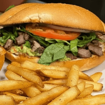 Marinated steak chunks, mayonnaise, lettuce, and tomato. Served with French Fries.