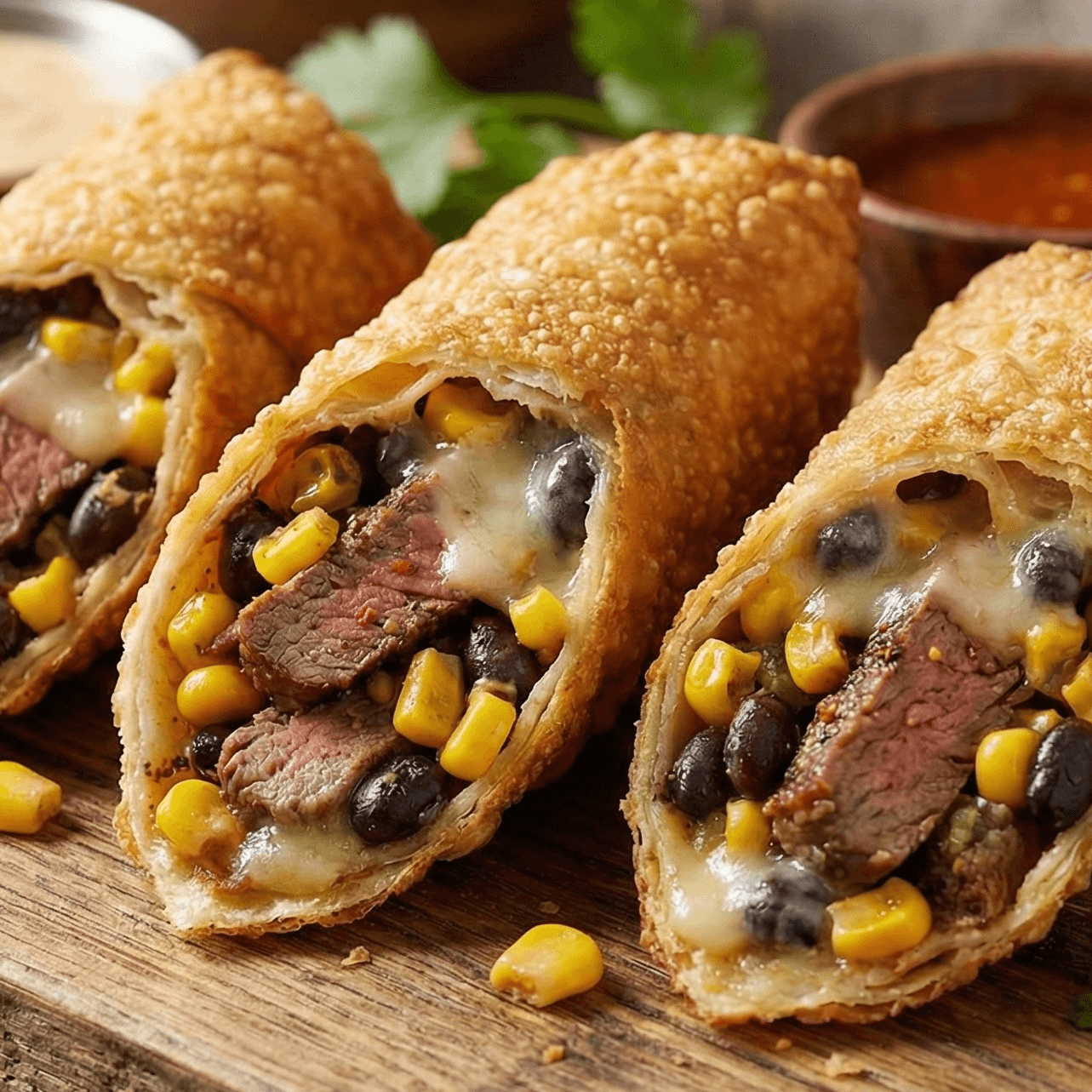 Delicious Mexican egg rolls, Steak, corn , beans and spices, served with avocado ranch.