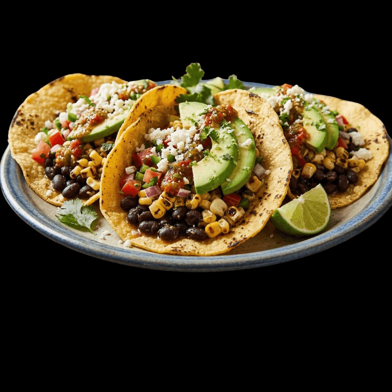 3 Tacos Corn tortillas - Black Beans - Roasted Corn Tomato - Grilled Onions - Grilled Bell Peppers Cilantro - Cotija Cheese - Avocado Slices