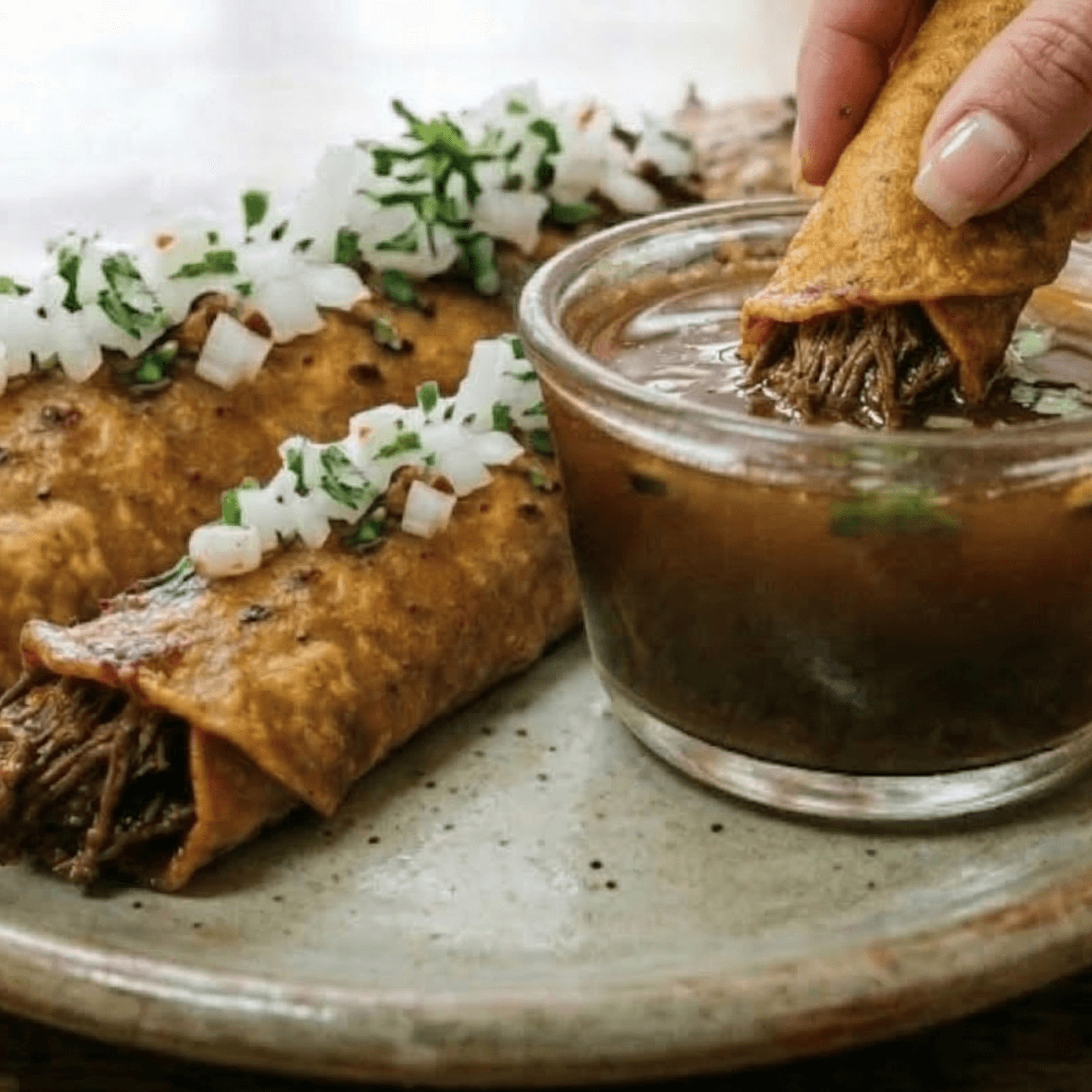 3 delicious crunchy birria taquitos, cilantro, diced onions and cotija cheese, served with consommé for dipping
