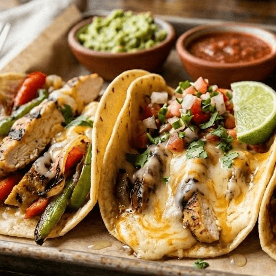 3 Fajita tacos prepared with melted cheese, sautéed bell peppers and onions, all wrapped in warm corn tortillas. Choice of grilled chicken or grilled steak!